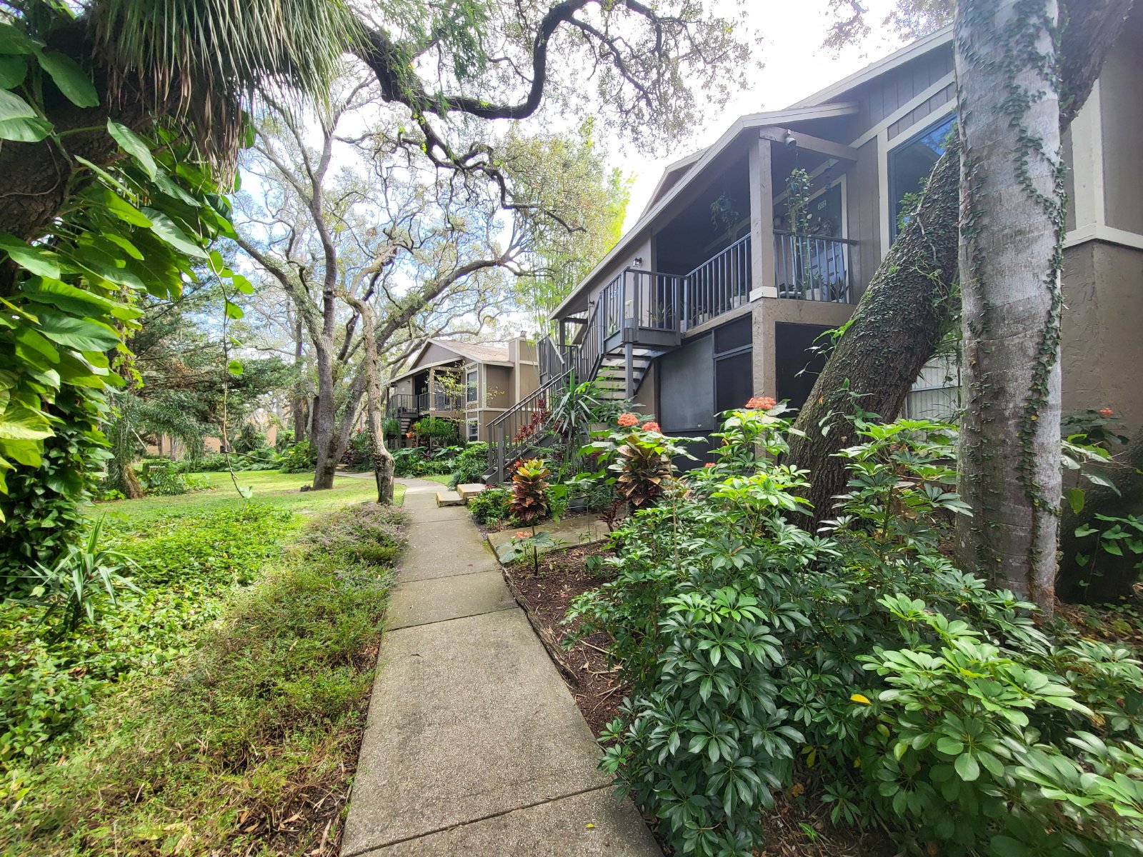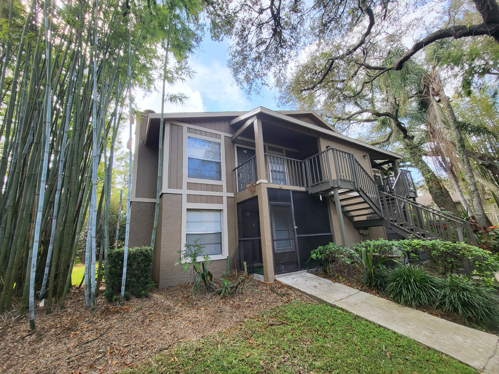 Enchanting 2 bed 2 bath condo nestled in the heart of 'The Oak's' a vibrant condo community with a beautiful tropical garden paradise vibe located a short stroll from USF and many restaurants, cafes, clinics and all that Tampa has to offer. Follow meandering trails through lush gardens to the 2nd story front porch deck overlooking the majestic oak and bamboo canopies. Enter to soaring cathedral ceilings and an open concept great room with a cozy fireplace and a living room that flows into an elegant formal dining room and a well equipped and bright galley kitchen. The primary bedroom offers a spacious bedchamber, large walk-in closet and a full ensuite. The 2nd bedroom is down the hallway on the opposite side steps away from the guest bath. The community recreation center is for residents and guests only and offers a large swimming pool, poolside club house, tennis and racquet ball courts. Check out the virtual tour and apply for this beauty before it's gone. Apply at dennisrealtyrentals.com. The Oaks is Conveniently Nestled on N. 42nd St. in Tampa with fast access to Bruce B. Downs, I-75, Moffitt Cancer Center and tons of shopping and restaurants! Twelve month lease. Water/sewer is Included in the Rent.